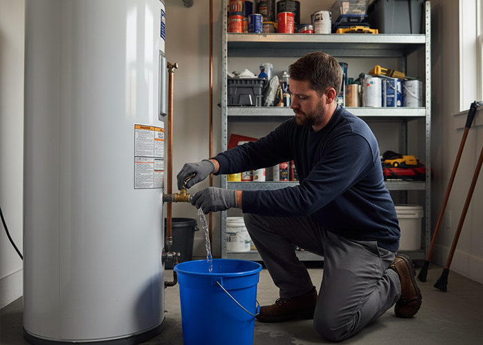 Mineral buildup makes heaters work harder. A quick partial drain helps remove sediment from the bottom of the tank. Turn off the power or set the gas control to vacation first, then close the cold-water supply and connect a hose to the drain valve.